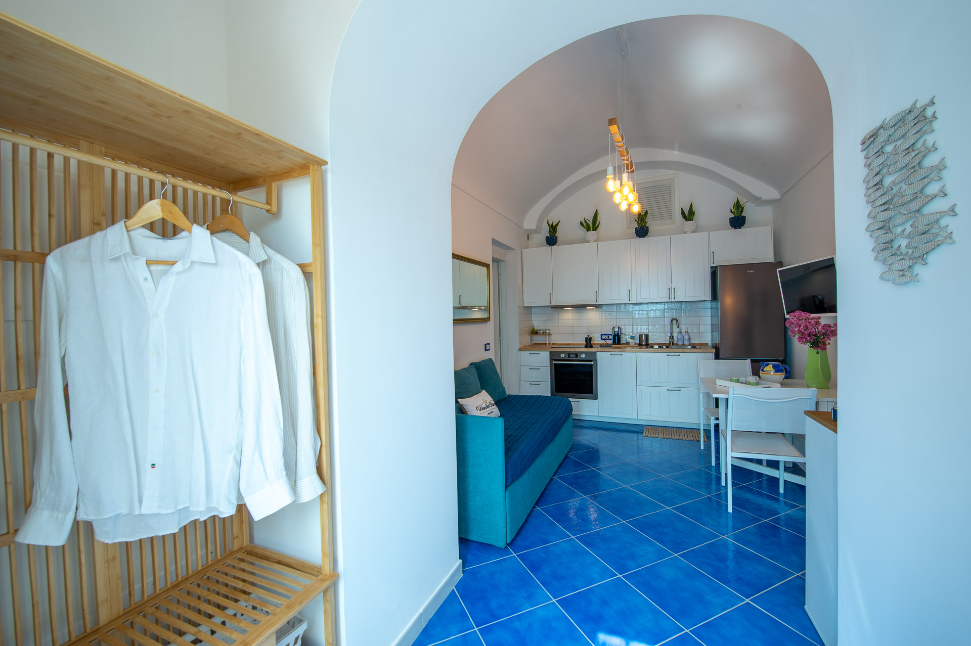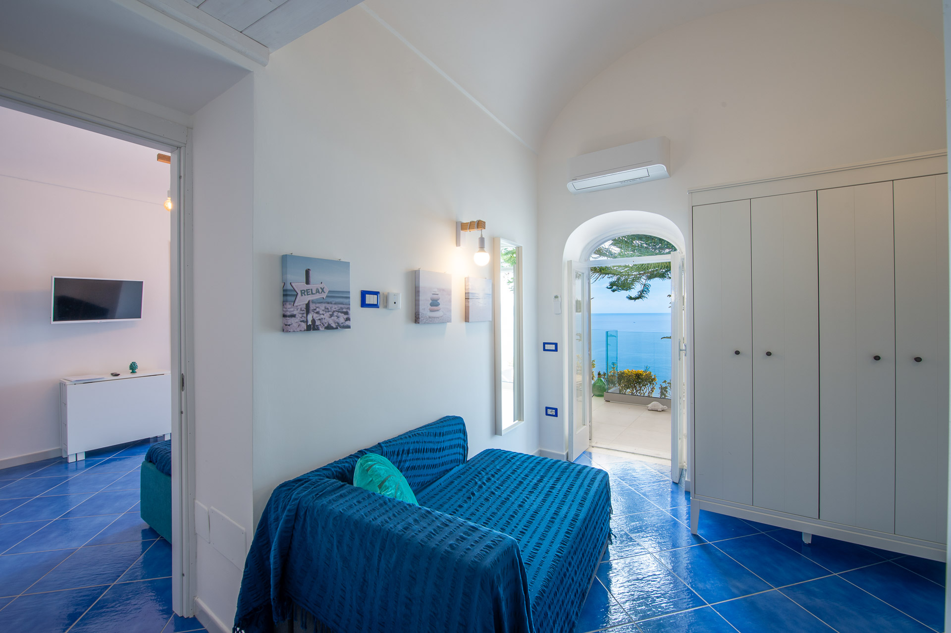 • Living Area: A cozy space featuring a large bench with soft Positano-style cushions, perfect for relaxing and enjoying the view. The designer furniture offers maximum comfort and style.