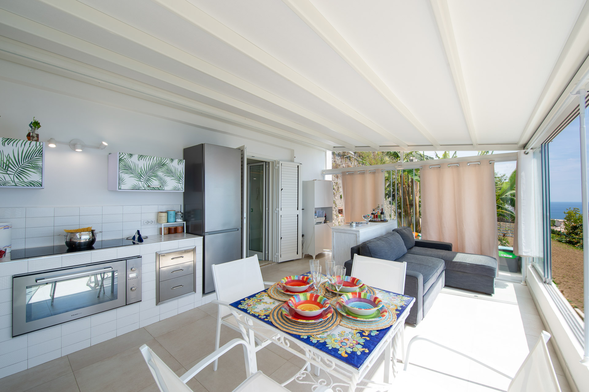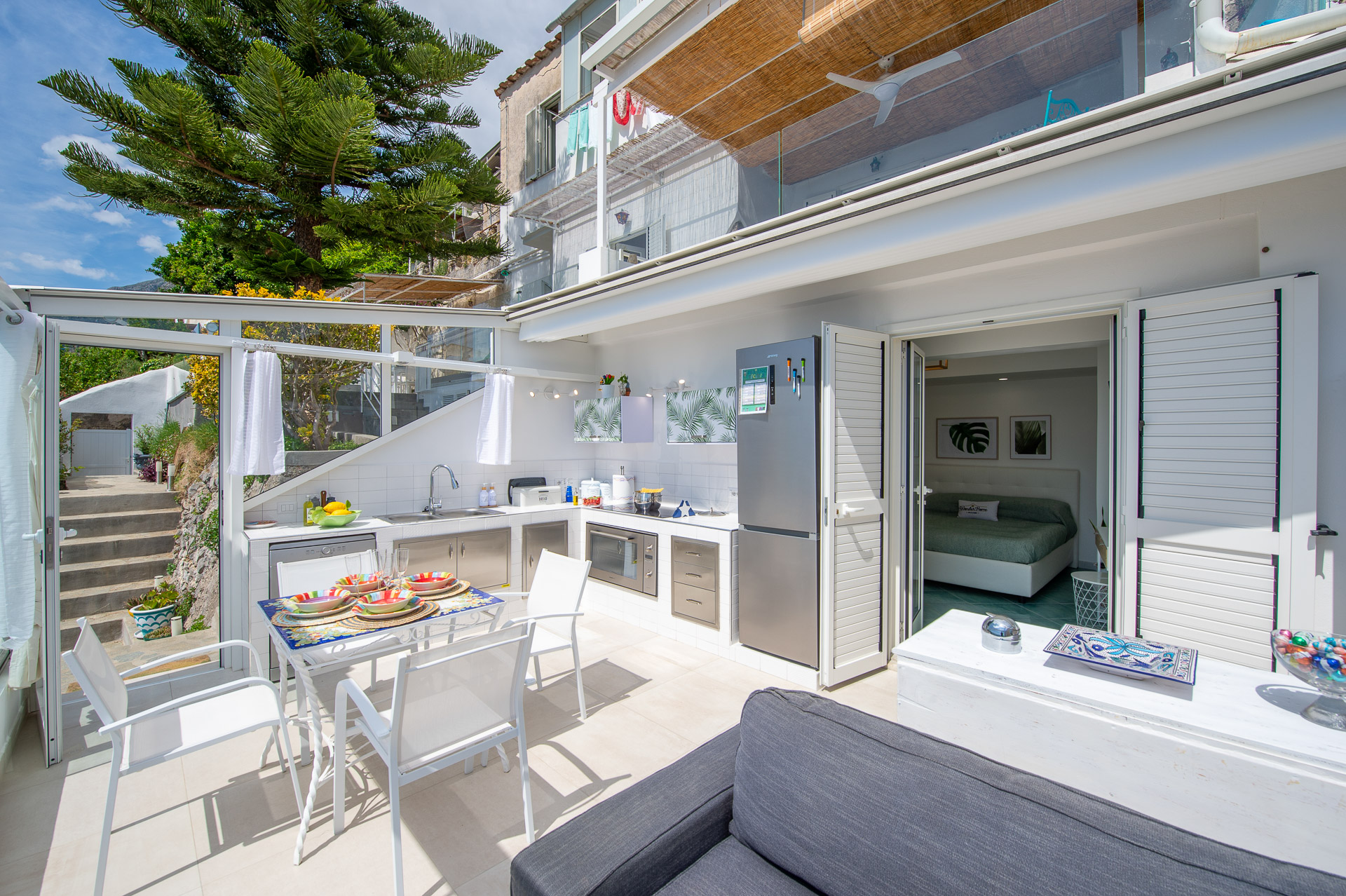 The kitchen, located outside on the terrace, allows you to cook and dine al fresco, enjoying the splendid sunset views. The terrace is ideal for moments of relaxation and conviviality.